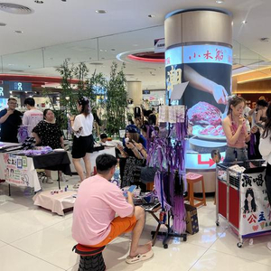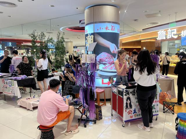 走进购物中心,记者注意到,两侧入口处的空地、商铺之间的走廊、原本用于摆放装饰物的转角处,如今都密密匝匝摆满了化妆编发、打印纪念票和演唱会周边的摊位,印有林俊杰经典歌曲名称的扇子、各式闪闪发亮的手环和发卡、造型可爱的卡通周边等商品琳琅满目,林俊杰的“应援色”是紫色,相关商品都是同色系,整个商场仿佛化身一片紫色海洋,热闹万分。
