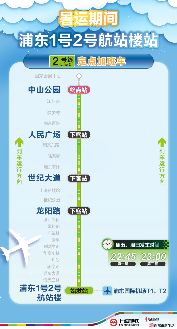 申通地铁集团介绍,暑运已至,为配合浦东国际机场夜间客流疏散,2025年7月4日至8月31日期间,每逢周五、周日,2号线浦东1号2号航站楼站,在22:30常态末班车后,加开2列定点加班车。定点加班车发车时刻分别为22:45、23:00,停靠站点为:浦东1号2号航站楼站、龙阳路站、世纪大道站、人民广场站,中山公园站。其中除始发站浦东1号2号航站楼站上客外,其余车站只下不上。详见↓