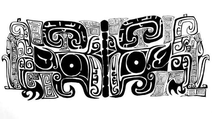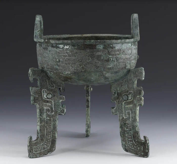 ▲商龙纹扁足鼎及其上的饕餮纹图案。图源:人民日报