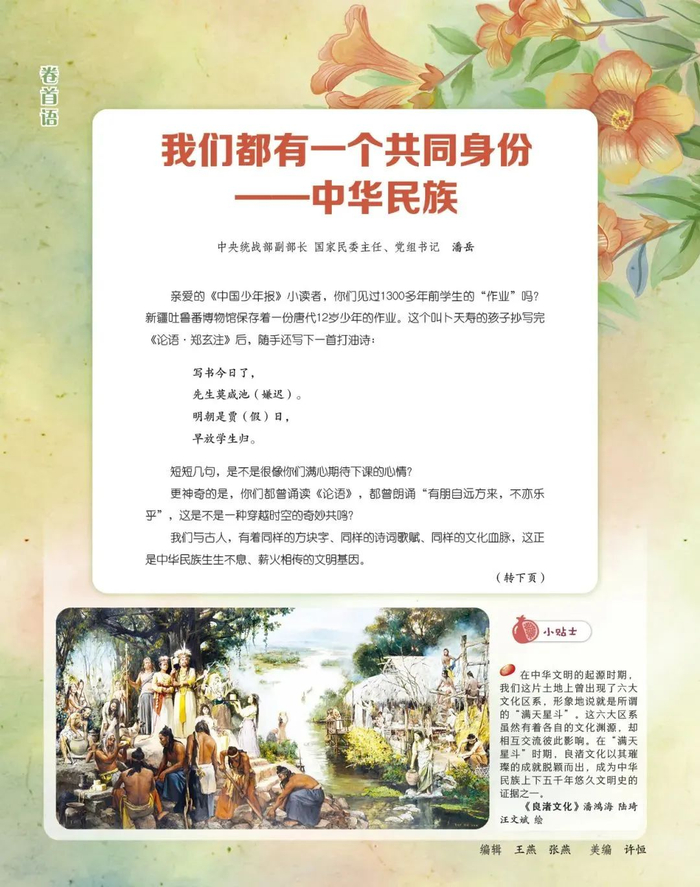(本文为中央统战部副部长,国家民委主任、党组书记潘岳为刚刚出版的《中国少年报》“小小石榴籽 童心向未来”专刊撰写的卷首语。)