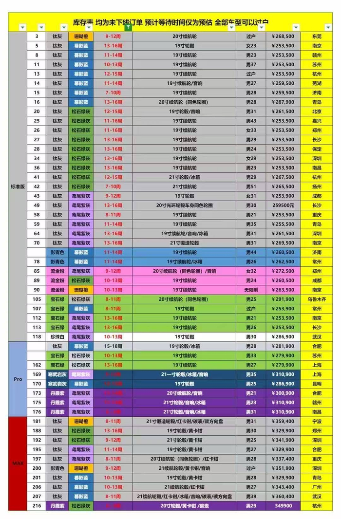 他也向搜狐科技展示了目前手上的小米YU7订单资源,标准版、Pro版、Max版都有,型号交付时间都在16周以内,颜色以钛灰居多,提车地点遍布全国各地。