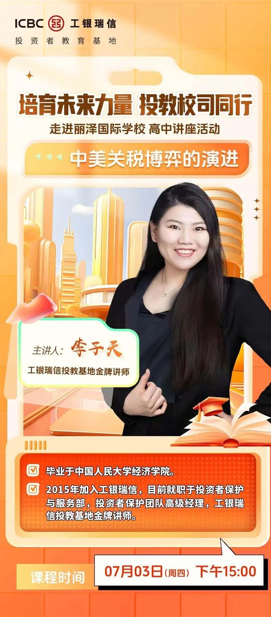 7月3日,工银瑞信投教基地走进北京丽泽国际学校高中部,聚焦近期国际金融热点事件,为对经济学金融学感兴趣的高中学生带来了《关税冲击如何影响全球经济与市场》专题讲座,带领学生感受市场脉搏,培育全球化视野。