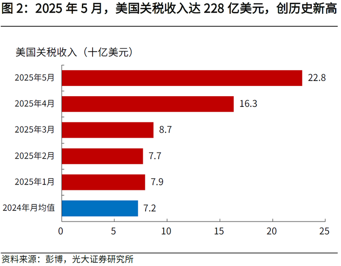 即使考虑激增的关税收入,后续美国财政依然有持续扩张风险。根据美国财政部数据,5月份美国关税收入达228亿美元,较4月的163亿美元进一步增加,是2024年月均值的3倍,按当前200亿美元/月的关税收入推算,未来十年可以减少2.4万亿美元赤字,但仍难以抵消减税法案带来的赤字压力。此外,关税合法性悬而未决,6月10日,美国联邦巡回上诉法院作出决定,在就相关案件作出裁定前(7月31日)前,特朗普政府关税政策仍可实施,但若后续关税政策被叫停,美国财政失衡压力将进一步增加。