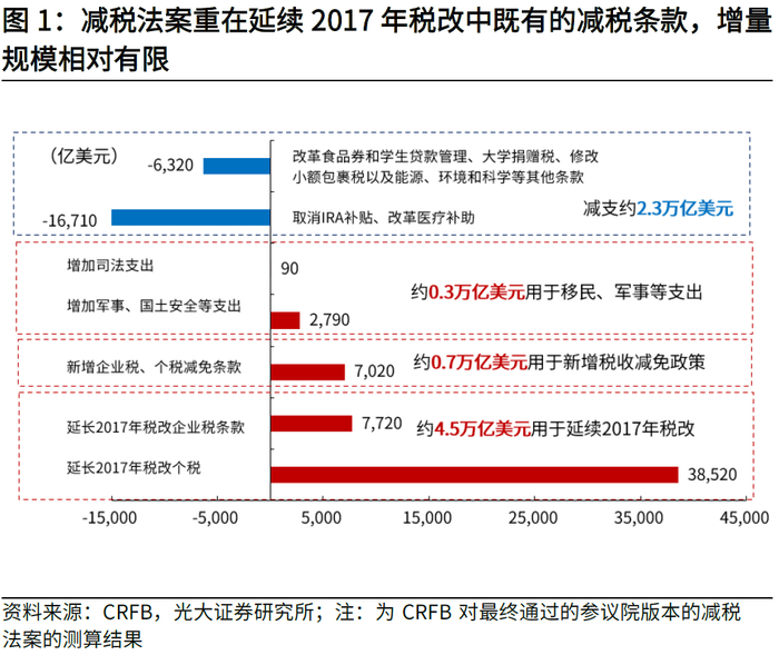 一是,在减税规模上,更多是“新瓶装旧酒”,重在延续2017年税改中既有的减税条款,增量规模相对有限。从减税规模上看,美国“负责任联邦预算委员会”(CRFB)测算结果指出,减税法案主要将延续2017年税改的个税和企业税部分条款,预计未来十年减税规模约4.5万亿美元,而如小费税抵免、汽车贷款利息免税等新增的税收减免政策规模仅为0.7万亿美元,可见本次税改更多是“新瓶装旧酒”,对经济增量相对有限。