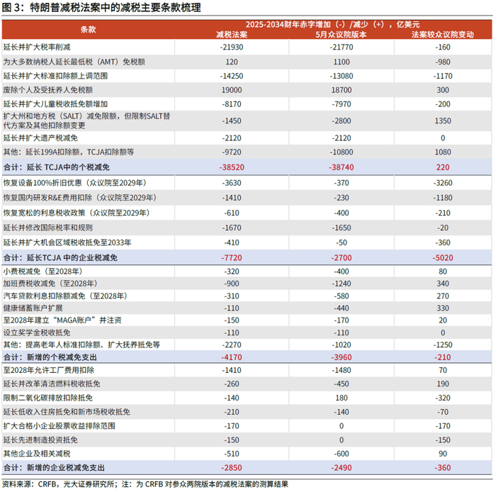 从原因上看,近期关税政策已经引起大量选民不满,特朗普为尽快推动减税法案,选择适度收缩减税规模,进行妥协,以争取共和党议员支持,提振经济预期。这体现在个人所得税和企业所得税未进一步降低税率,重在延长现有规定的执行期限;未全面取消遗产税,仅提高豁免额;部分税收优惠政策设定期限(如小费税抵免、汽车贷款利息免税、儿童税收抵免和标准扣除额仅临时生效至2028年)而并非永久性免税等方面。