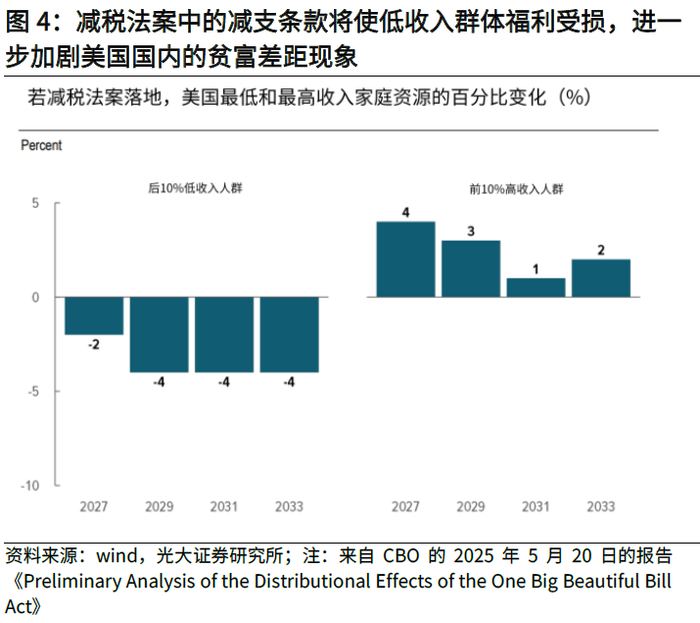 二是,由于减税法案削减了大量医保、营养等补助,低收入群体福利受损,进一步削弱减税对经济的刺激效果。CBO测算结果显示,从分配角度看,减税法案通过后,2027年美国后10%的低收入家庭的可支配资源将减少约2%,到2033年将下降4%,而同期美国前10%的高收入家庭的可支配资源将分别增加4%和2%。可见,高收入群体受益于减税优惠的延续,但减税法案中的减支条款将使低收入群体福利受损,对于中低收入群体而言,减税将难以抵消关税带来的负面效应。