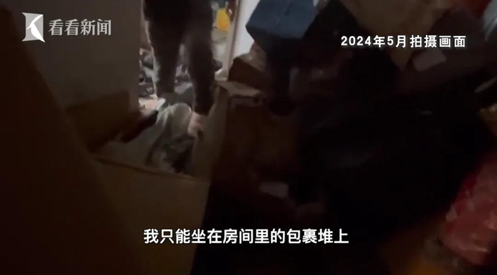 去年5月拍摄的画面,阿姨家快递堆积逼近屋顶,屋内无处落脚,她只能在快递堆里爬动。