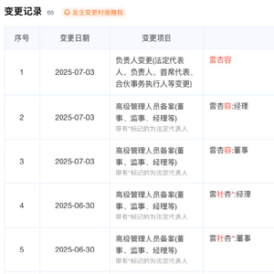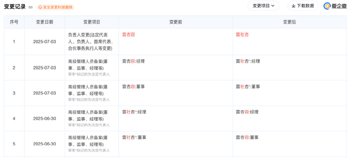 爱企查最新数据显示,7月3日该公司发生重大工商变更:雷杏容卸任法定代表人、董事及经理职务,由雷社杏重新接任。值得注意的是,这已是72小时内公司法定代表人的第二次更迭——6月30日的变更记录显示,上述职务刚从雷社杏转移至雷杏容。