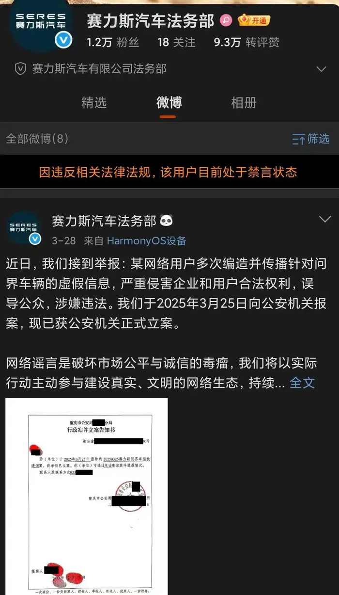 息,赛力斯汽车法务部官方微博账号于2025年7月4日因违反相关法律法规被禁言。据微博CEO王高飞回应,此次禁言的原因可能与之前另一家公司法务部被禁言的情况类似,即未经允许提前公开案情。在司法程序中,案件信息的披露有严格规定,擅自公开可能干扰司法公正。不过,当晚禁言已被解除。