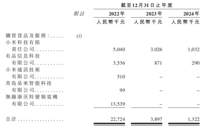 2022年-2024年,石头科技向小米的采购金额分别为908.6万元、389.7万元、132.2万元;同期,石头科技向小米的销售金额分别为1508.6万元、142.2万元、40.9万元。截至2024年末,公司对小米的贸易应收款项为356.7万元,贸易应付款项及应付票据为103.2万元。