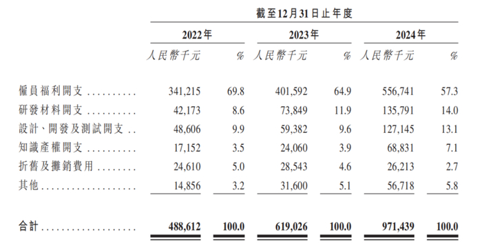 相比之下,石头科技的研发投入远不及销售开支,2022年-2024年,公司研发费用分别为4.89亿元、6.19亿元、9.71亿元,研发费用率分别为7.4%、7.2%、8.2%。
