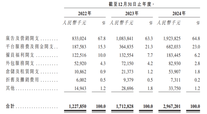 报告期内,公司的广告及营销开支分别为8.33亿元、10.83亿元、19.24亿元,累计达38.4亿元,占销售费用的65%。