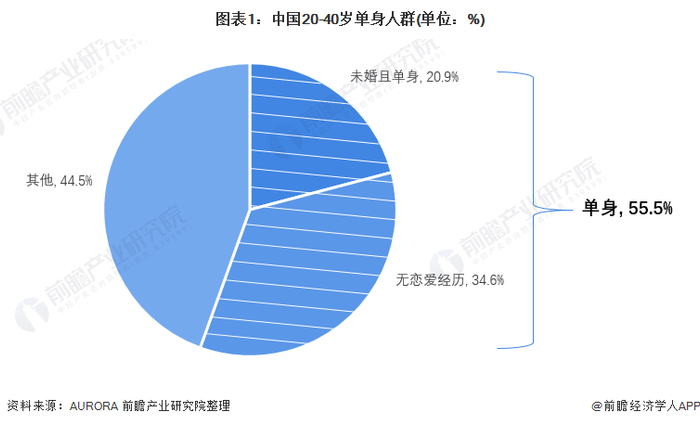 AURORA在2021年7月对单身群体做出的调研信息显示,我国20-40岁的单身人群占比已高达55.5%,且有超过三分之一的人群为“母胎SOLO”,即没有恋爱经验的人群。