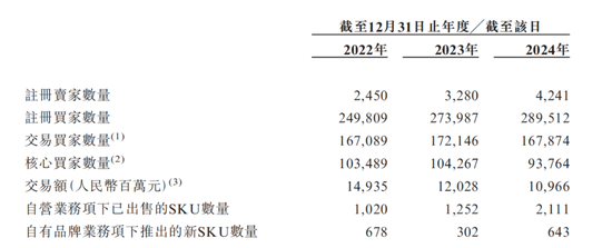 但纵向来看,过去三年,海拍客的GMV和核心买家数量都呈下滑趋势。2022-2024年,海拍客的GMV分别为149亿元、120亿元、110亿元;核心买家,即一年内在平台上下单超过24次的买家,从10.35万下滑到了9.38万,差不多减少了1万家。