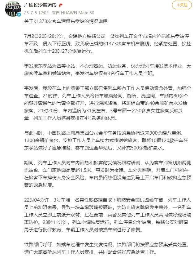 7月5日,广铁长沙客运段发布关于K1373次客车滞留东孝站的情况说明称:期间,列车工作人员对车内闷热和旅客耐受情况跟踪研判,认为客车滞留线路两侧无站台、车门离地面高度超1.5米、事发时为夜晚、车外无照明、开启车门可能存在旅客下车摔伤人身安全风险,车内虽闷热但没有达到马上开启车门和破窗应急预案的紧急程度。