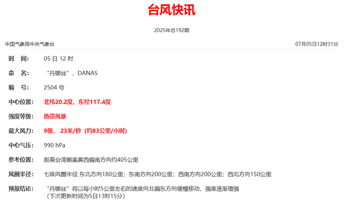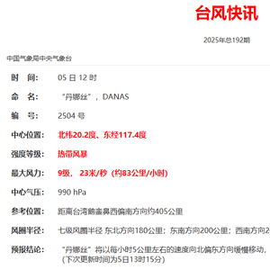 预计,“丹娜丝”将以每小时5公里左右的速度向北偏东方向缓慢移动,强度逐渐增强