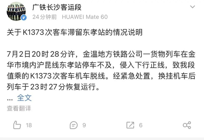 7月5日,@广铁长沙客运段 发布《关于K1373次客车滞留东孝站的情况说明》,全文如下: