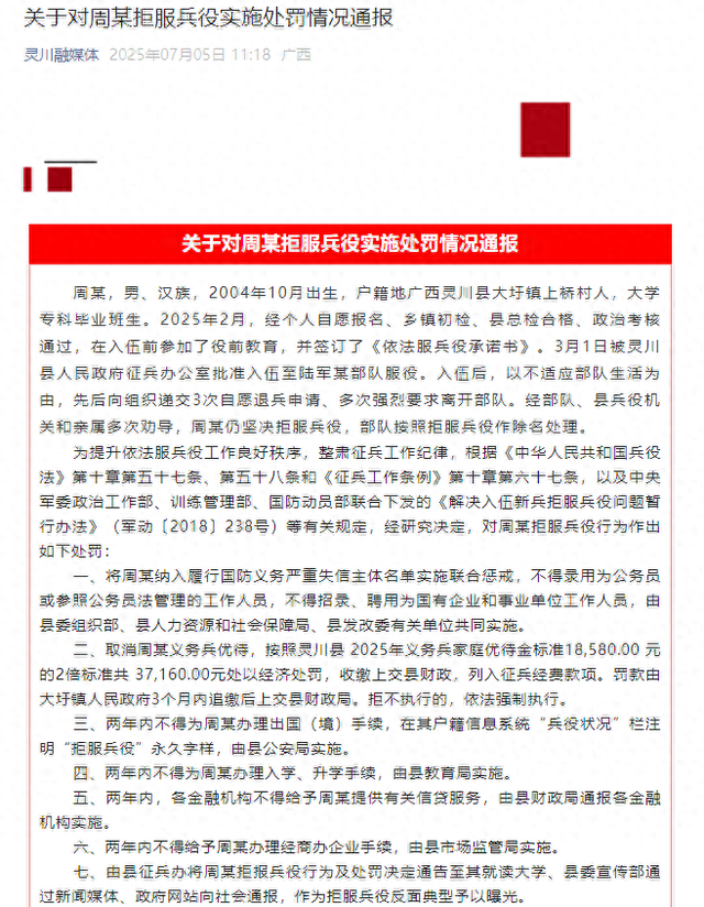 桂林一男子拒服兵役,官方通报:罚款37160元,不得录用为公务员