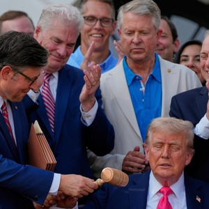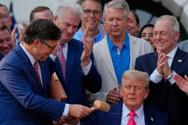 现场视频显示,特朗普当天在白宫签署该法案,并向观众展示签名,这时一旁的约翰逊从怀里掏出议事槌。“总统先生,这是用来通过‘大而美’法案的木槌。”约翰逊一边说一边把议事槌交给坐着的特朗普,“我想把它给你。”站在两人身边的许多共和党议员随即鼓掌。