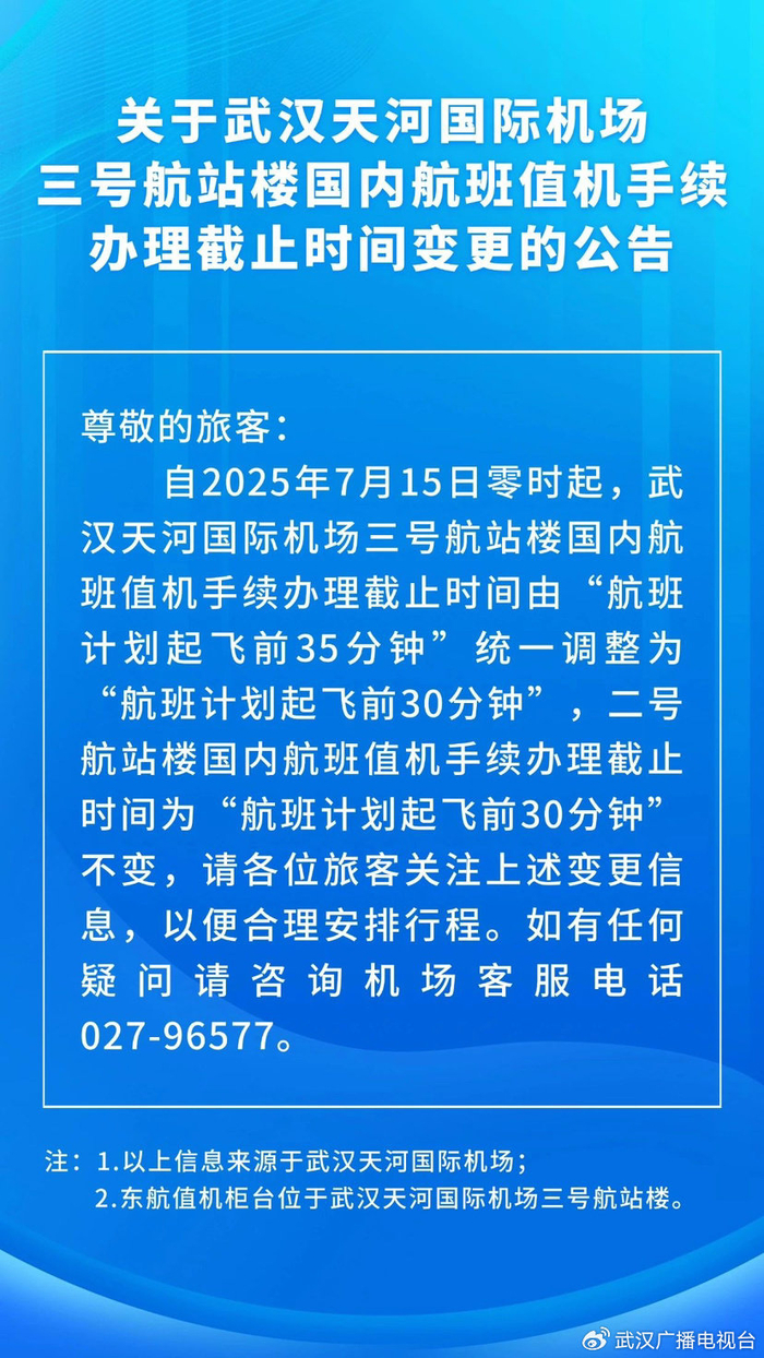 据武汉天河机场消息,自2025年7月15日零时起,武汉天河国际机场三号航站楼国内航班值机手续办理截止时间由“航班计划起飞前35分钟”统一调整为“航班计划起飞前30分钟”,二号航站楼国内航班值机手续办理截止时间为“航班计划起飞前30分钟”不变。