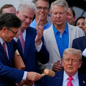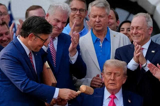 美国总统特朗普4日下午签署“大而美”税收和支出法案,标志着这一备受争议的法案正式成为法律。据澳大利亚新闻网报道,签署法案现场出现让不少美国人“炸锅”一幕:美国国会众议院议长迈克·约翰逊将标志着法案在国会通过的议事槌交给了特朗普,在批评者看来,这一幕象征着美国国会——与美国联邦政府平起平坐的一个机构——在美国总统面前“俯首称臣”。