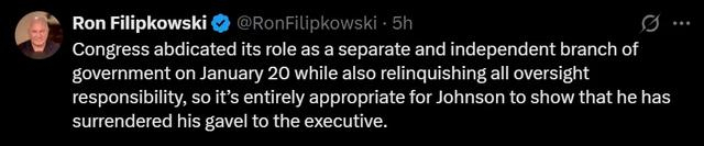 美国自由派媒体Meidas Touch主编罗恩·菲利普科夫斯基讽刺说,“国会于1月20日放弃了自己独立于政府的职能,同时也放弃了所有监督责任,所以约翰逊向行政部门交出他的小木槌是‘完全合理的’。”