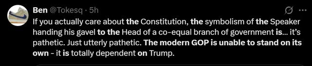 另有网友留言,“如果你真的关心维护宪法(尊严),那么当议长把他的议事槌交给同等地位政府负责人的象征意义……分明是可悲。简直太可悲了。现代共和党无法独立自主——它完全依赖于特朗普。”