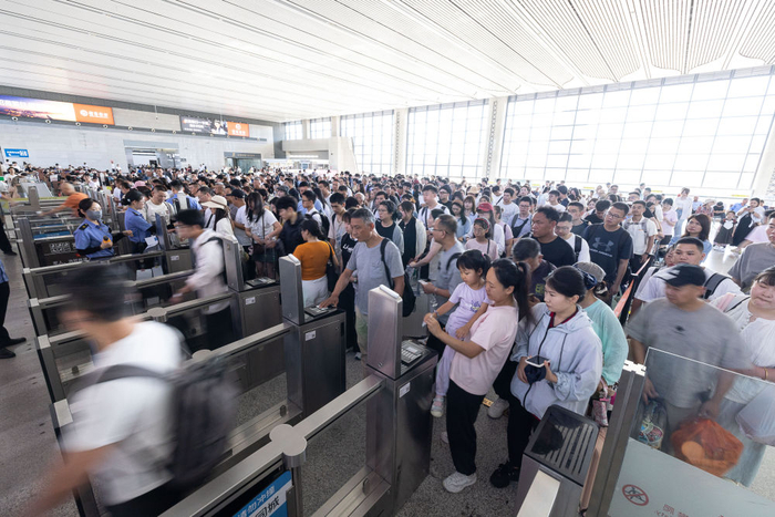 7月1日,旅客在浙江湖州站依次检票进站。当日,全国铁路实行新的列车运行图,同时为期62天的2025年全国铁路暑期运输也拉开帷幕。 新华社发(伊凡摄)