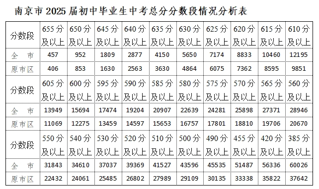 上表中的分数包括7门文化科目考试成绩(含英语听力口语考试成绩)、体育考试成绩和政策性照顾加分。浦口区、江宁区、六合区、溧水区、高淳区的分数段情况,由区考试中心(招考办)向本区考生公布。