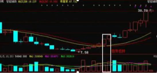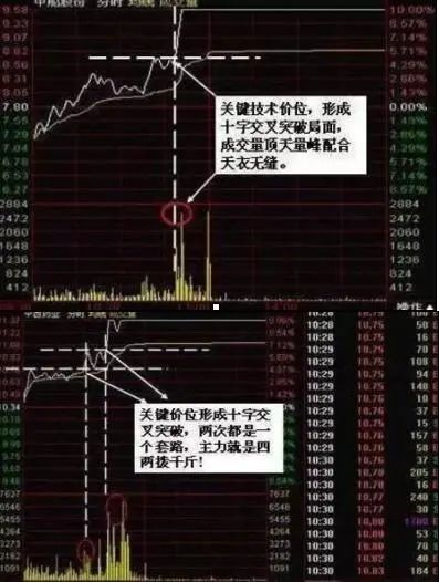在图十字线的上下线和底下的峰量重合,实际上这一点上就是股价突破新高的位置,在盘口分析中突破高点时必须放量。主力就是利用这种技术形态的突破,做出一种强势上攻的样子,来吸引更多的跟风者。