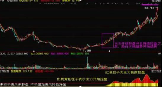 月线和日线控股盘度的对比分析,可以发现月线下降趋势的中股票主力控盘度基本为零,或者说从来都不控盘,当主力开始控盘时,股价逐步放量上涨,月线形态开始发生变化,月线一旦确定向上,大周期的上涨就开始,而持续性就看主力是否持续控盘。