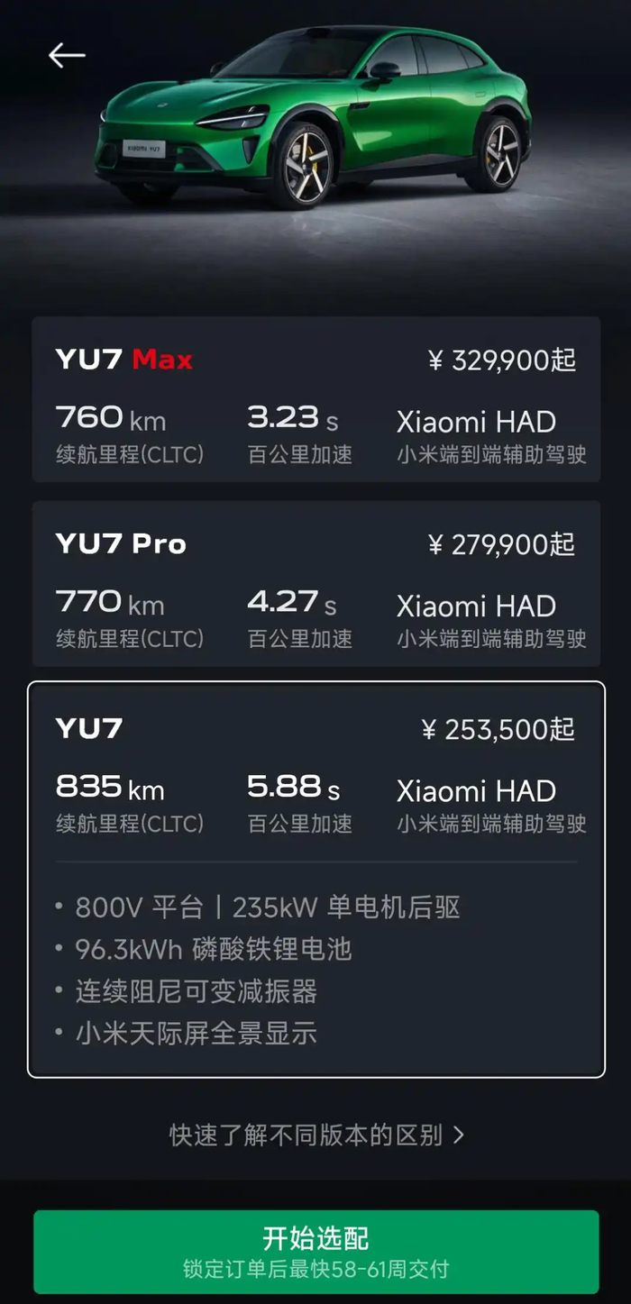 从交付周期看,小米汽车订购页面显示,YU7 标准版锁单后交付周期为57-60周,Pro 版为50-53周,Max 版为37-40周。也就是说,今年下定金的部分车主,明年才能提车。