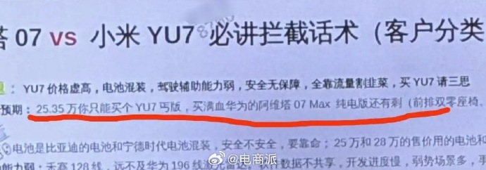 更狠的是,有的友商还专门写了“截单话术”,主动联系YU7车主劝其转单。