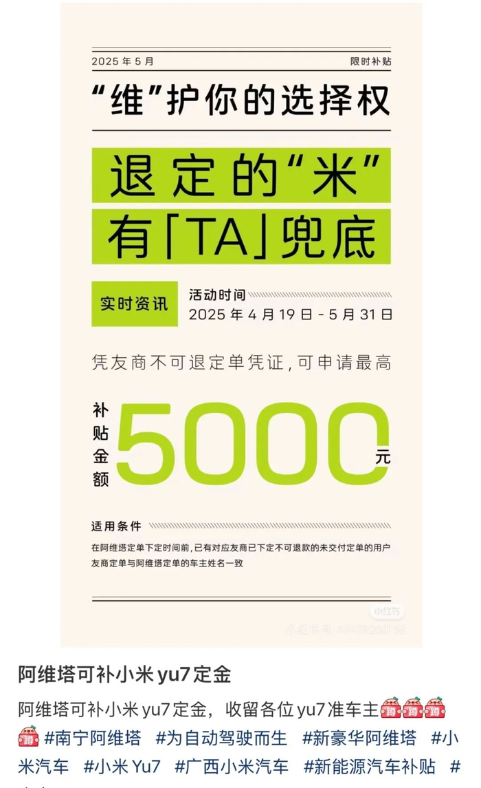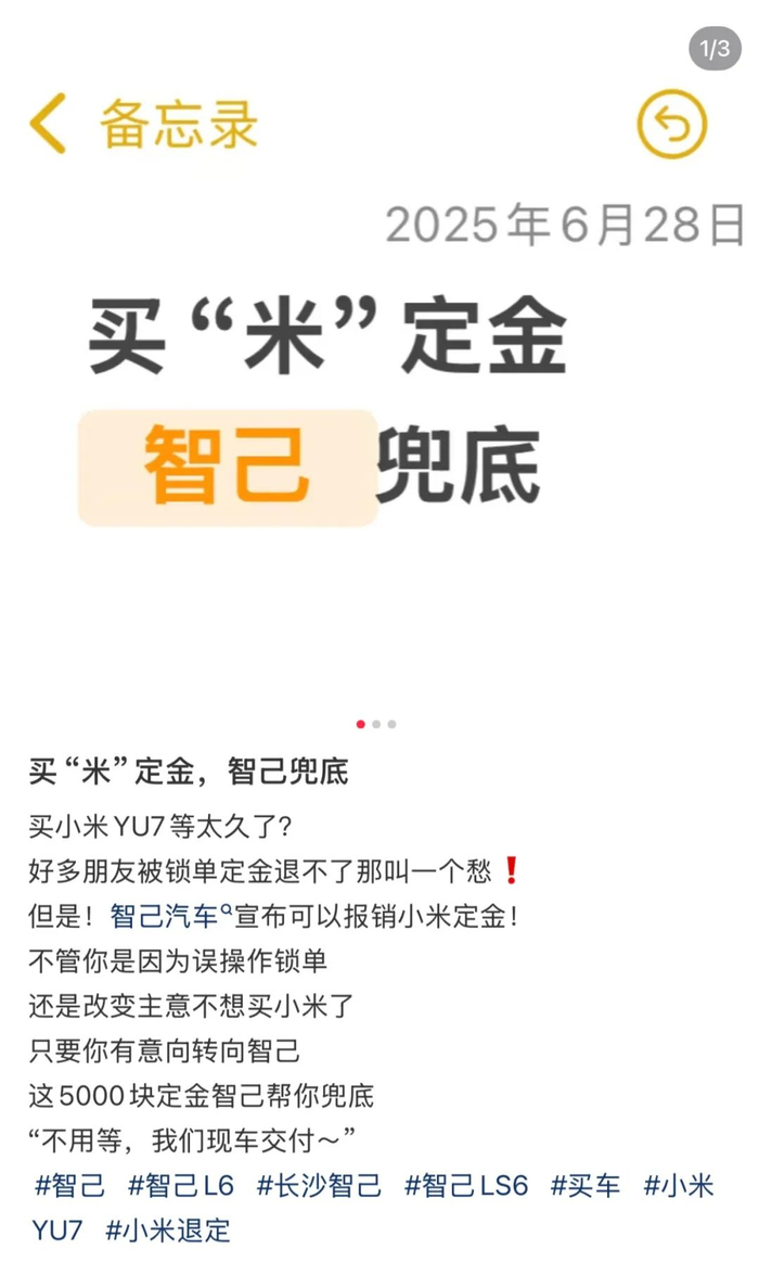这也让友商们趁机钻了空子。智己、蔚来、极氪、智界、阿维塔等品牌近期开始花式截胡雷军的订单。也就是说,下单了小米YU7定金的用户,如果转买其他品牌的车,就会有相应的“补偿”,称“愿意为YU7用户提供退订补齐定金的福利。”