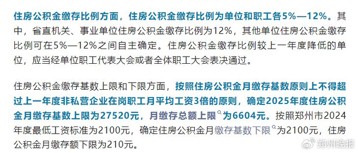 郑州调整2025年度住房公积金缴存基数和缴存比例:2025年度住房公积金月缴存基数上限为27520元,月缴存额上限为6604元;住房公积金月缴存基数下限为2100元,月缴存额下限为210元。