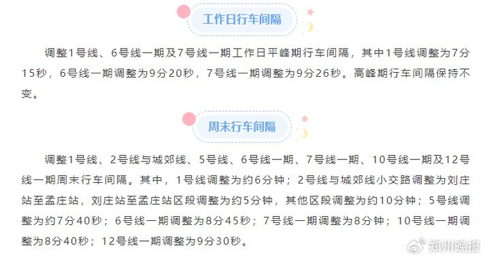 自7月7日起,郑州地铁启用暑期时刻表,调整部分线路行车间隔↓