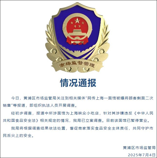 近日,上海一面馆被曝将剩面二次销售。7月4日,上海市场监管局通报:已对此立案调查,涉事面馆已暂停营业。