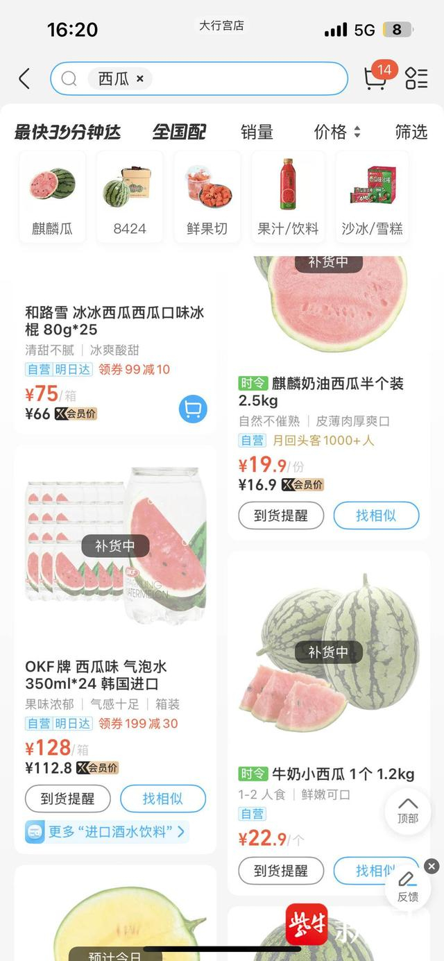 “盒马的好几款西瓜都售罄了!”5日下午,家住张府园一带的王女士向记者反馈,她午后准备点盒马外卖时,发现附近门店的四款西瓜都售罄了,仅剩一款上海南汇产的精品西瓜,一个瓜要69.9元,约8.7元一斤。