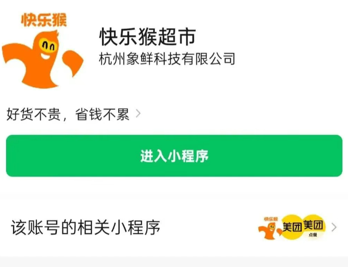 从业务筹备来看,“快乐猴”的布局早有伏笔。早在2025年初,美团旗下北京象鲜科技有限公司就密集注册了“快乐猴”、“矮脚猫”等商标,覆盖食品、日化、医药等30余类目;4月上线的微信小程序显示,其定位为“好货不贵,省钱不累”,认证主体为杭州象鲜科技有限公司,隶属美团小象超市体系。尽管美团官方回应“没有信息”,但商标注册与小程序上线已暴露其战略意图。