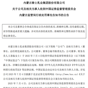 同日,骑士乳业及相关当事人收到内蒙古证监局下发的《行政处罚事先告知书》,告知书披露了公司涉嫌违法违规事实及处罚依据及结果,拟决定对骑士乳业责令改正,给予警告,并处以200万元罚款,对相关当事人合计处以140万元罚款。