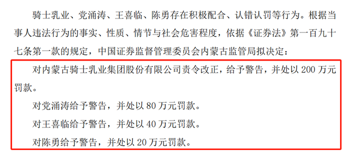 鉴于骑士乳业及相关当事人的上述行为,内蒙古证监局拟决定对骑士乳业责令改正,给予警告,并处以200万元罚款;对党涌涛给予警告,并处以80万元罚款;对王喜临给予警告,并处以40万元罚款;对陈勇给予警告,并处以20万元罚款,总罚金340万元。