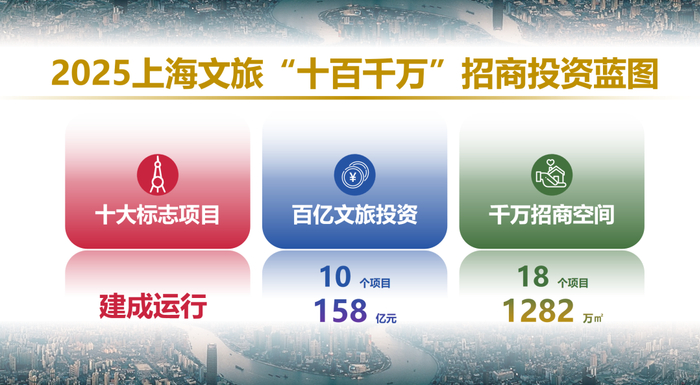 会上,上海发布了十大标志性项目、百亿年度文旅投资、千万平方招商空间,以“硬核”项目矩阵重塑旅游目的地体系。其中,十大标志项目涵盖上海乐高乐园度假区、水乡客厅·方厅水院、“浦江之钻”西岸会展中心、上海大歌剧院、前滩华尔道夫酒店、上海文学馆、东方美谷自然堂未来时尚旅游城、东方智媒城、长滩观光塔、虹桥SHOWAY世界秀场等10个2025年开放运行项目。千万招商空间包括金山滨海国际文化旅游度假区核心区、国际旅游度假区南一片区“东方乐城”等18个项目超1280万平方米载体空间。