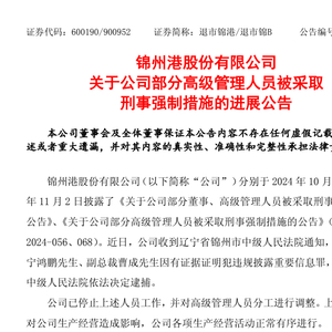 2024年11月2日,锦州港再次公告,因涉嫌违规披露重要信息罪,锦州市公安局决定对公司副总裁宁鸿鹏取保候审。