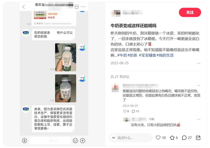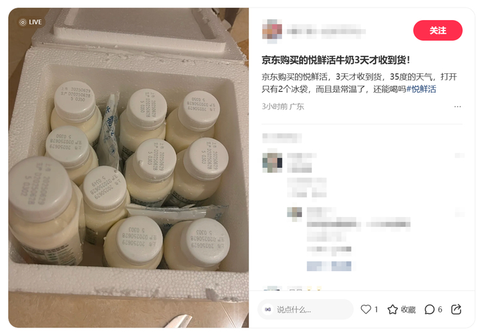 事实上,这并非悦鲜活牛奶首次因冷链运输问题遭消费者质疑。在网络社交平台上,有多条关于悦鲜活牛奶变质的投诉。2023年8月25日,一网友表示,牛奶泡沫箱仅1个冰袋且已化,放入冰箱后,饮用时发现内部有白色块状物,口感恶心,虽店家称正常,但其仍不敢饮用。