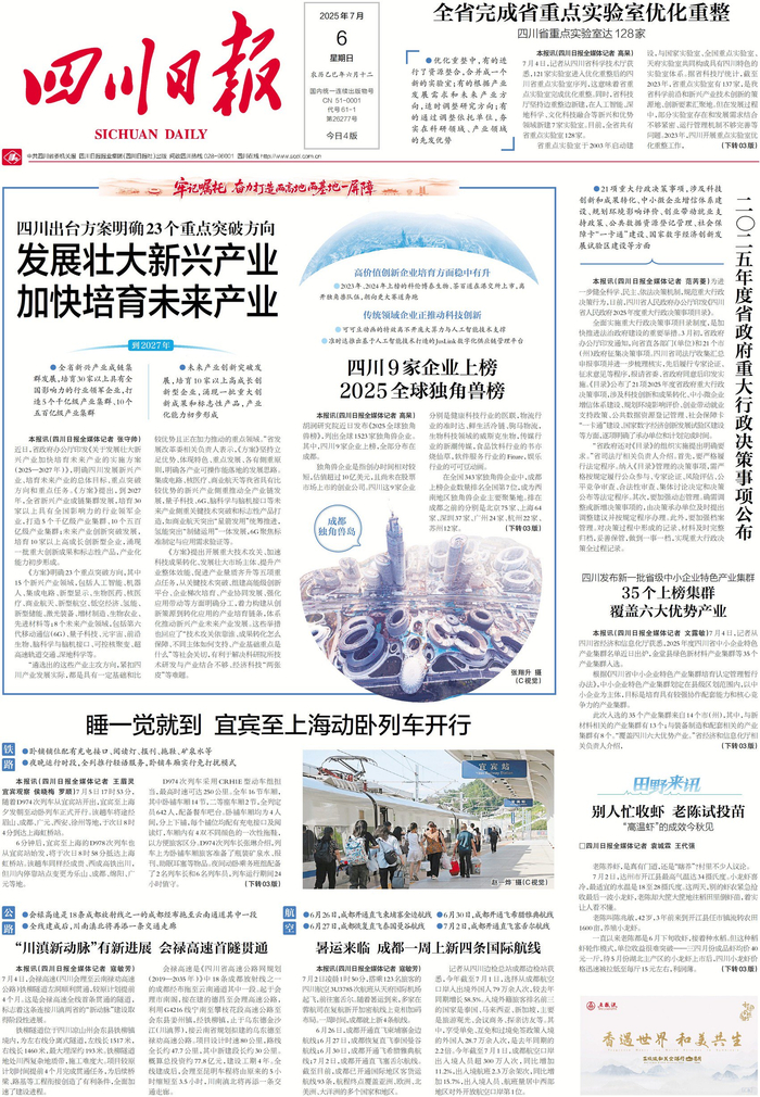 胡润研究院近日发布《2025全球独角兽榜》,列出全球1523家独角兽企业。其中,四川成都9家企业上榜,主要分布在健康科技、物流、生物科技、软件服务、娱乐等行业。近年来,四川产业发展动能强劲,近日,《关于发展壮大新兴产业加快培育未来产业的实施方案(2025—2027年)》出台,也彰显出四川在支持产业发展上的强劲力度。《方案》提出,将培育30家以上行业领军企业、10家以上高成长创新型企业。更多详情,请看今日1版。
