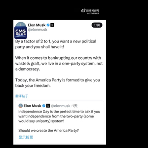 另据央视新闻7月5日消息,在美国总统特朗普7月4日将“大而美”法案签署成法的几个小时前,特朗普的前盟友、企业家埃隆·马斯克通过社交平台发起了一项关于成立美国新政党的投票。