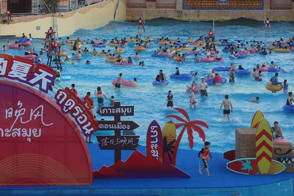 地道泰式美食、特色商品、高颜值NPC天团、千灯心愿派对等惊喜轮番上演,游客可放肆体验40多个大型水上项目,在20万平方米泰式乐园中开启夏日之旅。