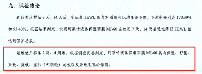 经检测,珂莱诗液体面膜兼具保湿、舒缓、抗皱、紧致毛孔的功效。