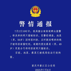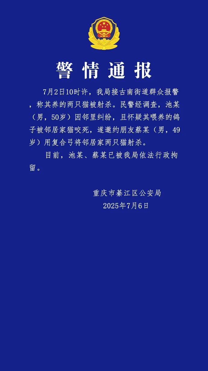 7月6日,重庆市綦江区公安局通报,7月2日10时许,该局接古南街道群众报警,称其养的两只猫被射杀。民警经调查,池某(男,50岁)因邻里纠纷,且怀疑其喂养的鸽子被邻居家猫咬死,遂邀约朋友蔡某(男,49岁)用复合弓将邻居家两只猫射杀。目前,池某、蔡某已被依法行政拘留。
