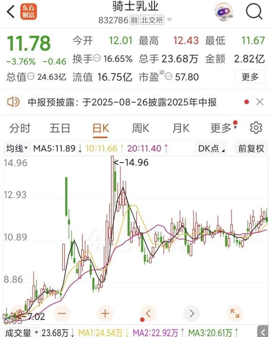 截至7月4日,骑士乳业股价收于11.78元/股,当日跌3.76%,对应的总市值为24.63亿元。